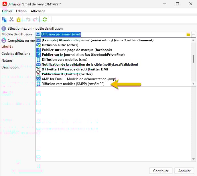 Renommez votre diffusion dans le champ Libellé et ajoutez des informations dans le champ Code diffusion et la liste Nature si nécessaire pour le suivi. Vous pouvez également ajouter une description à votre diffusion.