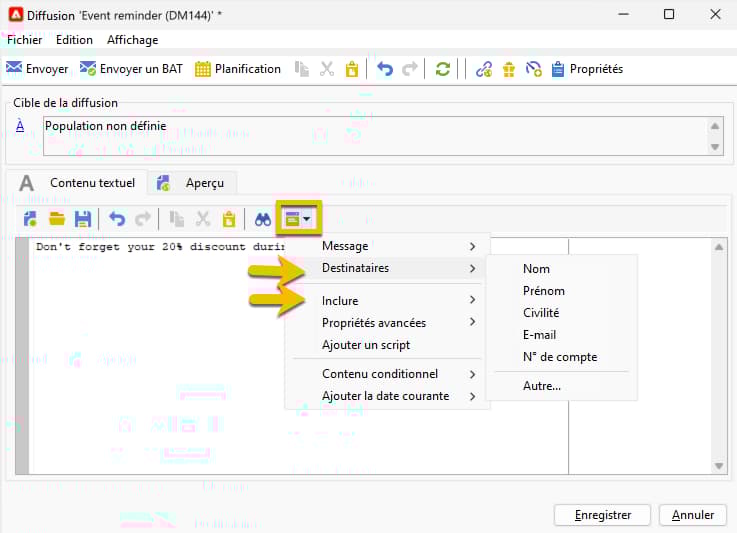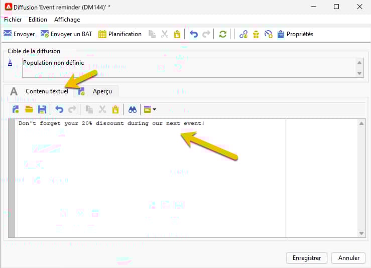 Saisissez le contenu du message dans l’onglet Contenu texte.