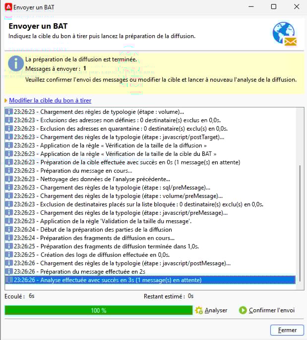 Adobe Campaign effectuera tout le contrôle avant de valider l’envoi du BAT. À la fin de l’analyse, le bouton Confirmer la diffusion ne sera pas cliquable. {modal="regular"}