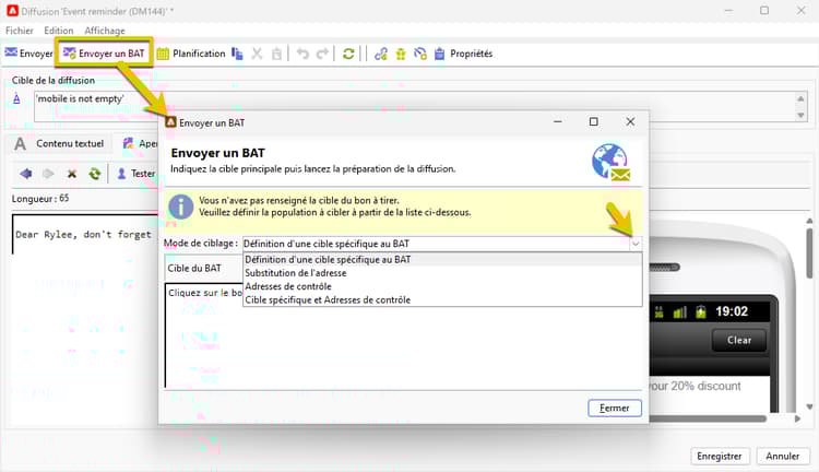 Vous pouvez envoyer un BAT pour votre diffusion SMS afin de la valider :