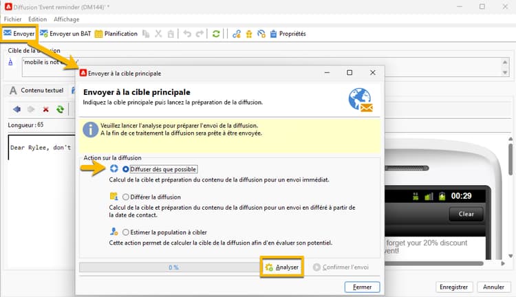 Dans la fenêtre qui s’ouvre, choisissez l’action qui vous convient.Dans l’exemple ci-dessous, nous choisissons de le diffuser dès que possible, le bouton Analyser s’affiche. Nous cliquons sur ce bouton Analyser.