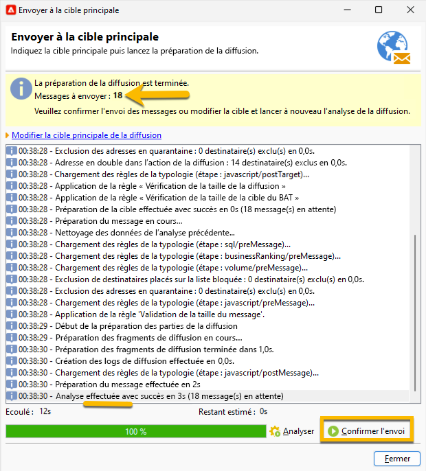 Adobe Campaign effectuera tout le contrôle avant de valider l’envoi du BAT. Vous y verrez le volume réel de l’audience. À la fin de l’analyse, le bouton Confirmer la diffusion ne sera pas disponible.