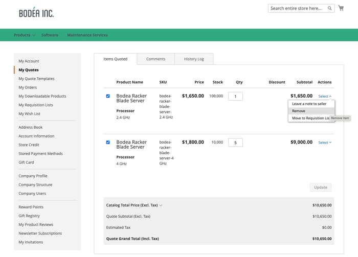 View / Send for Review / Delete Quote / Edit Quantity / Delete SKU / Add Comments / Edit Shipping Address