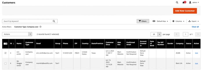 Dans Admin, accédez à la grille Customer en sélectionnant Customers, puis sélectionnez All Customers.