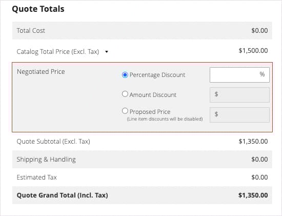Dans la section Quote Totals - Negotiated Price , sélectionnez le type de remise, puis saisissez la valeur à appliquer.
