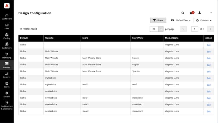 Dans la barre latérale Admin, accédez à Content > Design>Configuration.