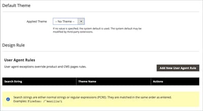 [PaaS uniquement]{class="badge informative" title="S’applique uniquement aux projets Adobe Commerce on Cloud (infrastructure PaaS gérée par Adobe) et aux projets On-premise."} Si le thème doit être utilisé uniquement pour un appareil spécifique, définissez la User Agent Rules .