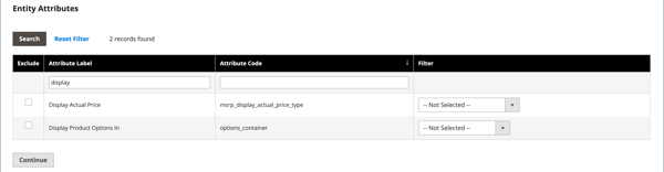 Pour exporter uniquement les enregistrements avec des valeurs d’attribut spécifiques, saisissez la valeur requise dans la colonne Filter. L’exemple suivant exporte uniquement un SKU spécifique.