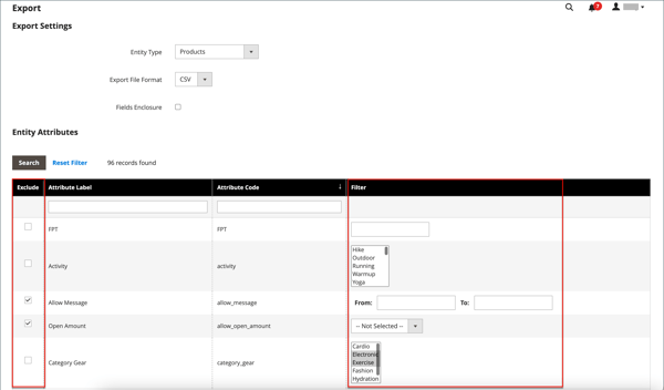 Pour inclure uniquement les enregistrements avec une valeur spécifique, telle qu’un SKU, saisissez la valeur dans le champ Filtre . Certains champs tels que Prix, Poids et Définir le produit comme nouveau comportent une plage de valeurs de/à.