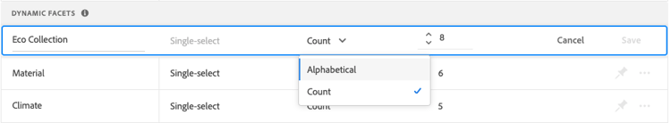 (Découplé uniquement) Pour modifier la méthode utilisée pour trier les valeurs de facette, cliquez sur la valeur de la colonne Type de tri et choisissez l’une des options suivantes :