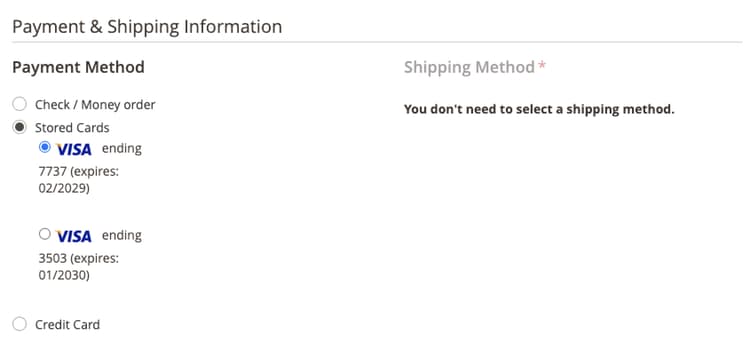 Dans Payment & Shipping Information, sélectionnez Stored Cardscomme mode de paiement.