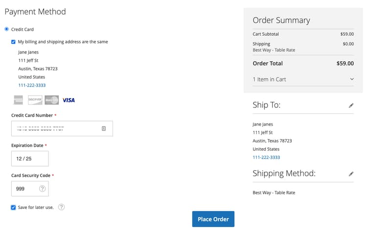 Convertissez les clients occasionnels en clients fidèles avec la chambre forte de carte de crédit. Les clients connectés peuvent enregistrer (ou « mettre en coffre ») leurs informations d’identification de carte de crédit pour les utiliser lors d’un achat ultérieur pour le même magasin ou un autre dans le même compte commercial.