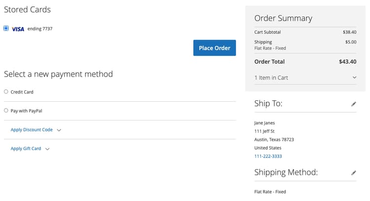 Tous les modes de paiement voûtés utilisent l'adresse de facturation définie lors de la voûte de la carte, qui se trouve dans le compte PayPal de l'acheteur. Le client peut voir une adresse de facturation différente de celle affichée dans Commerce. -