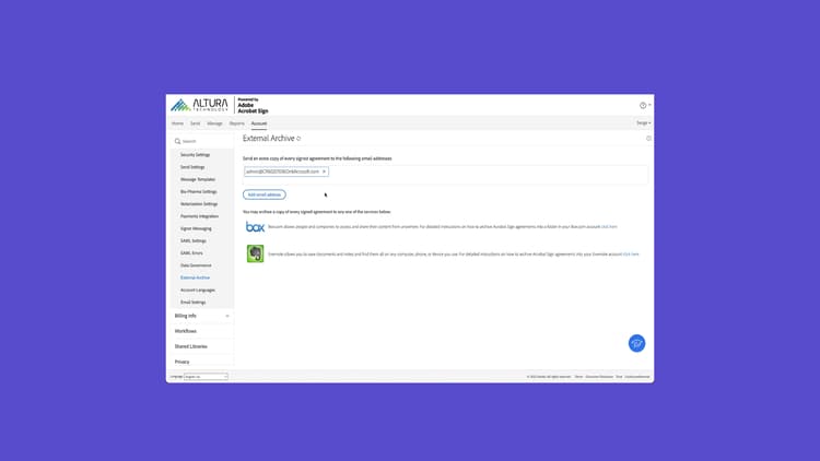 Découvrez comment ajouter des utilisateurs à votre compte, configurer des groupes, partager l’accès et configurer un workflow, une archive externe, ainsi que des événements et alertes partagés. Ces tutoriels sont conçus pour les administrateurs qui ont dépassé la phase d’installation et sont prêts à commencer à administrer Acrobat Sign. Les tâches avancées couvrent des rubriques qui s’étendent au-delà de la configuration de l’administrateur et abordent la définition des paramètres généraux, le partage et l’accès au compte, ainsi que le balisage de texte.