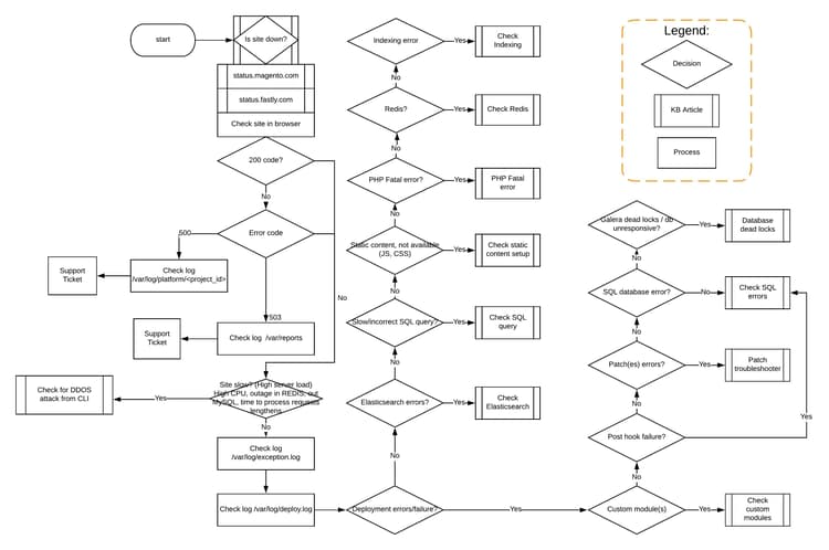 Utilisez le diagramme de dépannage site en bas d’Adobe Commerce pour identifier et résoudre les causes des pannes du site.