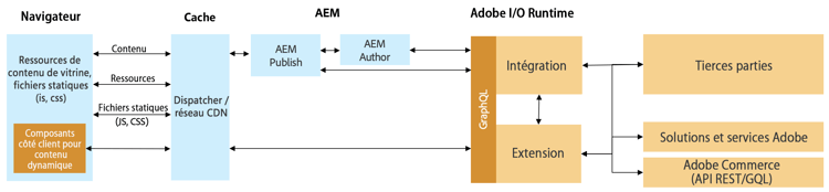 Cette couche d’intégration a pour but de mapper des API et des schémas tiers vis-à-vis des API et des schémas Adobe Commerce GraphQL pris en charge en dehors d’Experience Manager. Grâce à cette encapsulation, la logique d’intégration et les systèmes peuvent être mis à jour sans modifier le code dans Experience Manager.