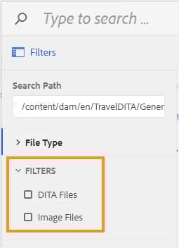 ui_config.json, ajoutez la définition des filtres que vous souhaitez ajouter.Le fragment de code suivant montre comment ajouter deux options de filtrage : Fichiers DITA et Fichiers image.