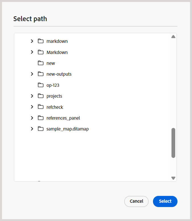 Cette version introduit une interface plus épurée et plus intuitive pour parcourir les fichiers et les chemins d’accès aux dossiers dans Experience Manager Guides.