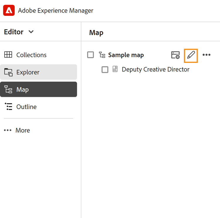 note note NOTE Pour utiliser l’éditeur de mappages avancé, accédez au fichier de mappage dans l’éditeur. Si votre administrateur a configuré l’éditeur de carte avancé comme éditeur par défaut dans les fichiers de carte, le fichier de carte est ouvert directement dans l’éditeur de carte avancé pour être modifié. Consultez la section Définir l’éditeur de carte avancé par défaut dans Installation et configuration d’Adobe Experience Manager Guides as a Cloud Service.
