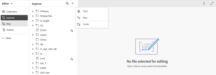 Dans le panneau Explorateur, sélectionnez l'icône Nouveau fichier puis sélectionnez DITA Map dans le menu déroulant.