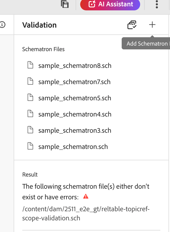 Si le fichier Schematron ne comporte aucune erreur, il est ajouté et répertorié dans le panneau Validation . Un message d’erreur s’affiche pour le fichier Schematron contenant les erreurs.