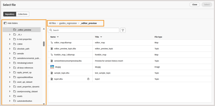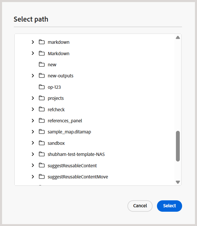 Experience Manager Guides propose des boîtes de dialogue intuitives (Sélectionner un fichier et Sélectionner un chemin d’accès) pour vous aider à parcourir et à sélectionner efficacement des fichiers ou des dossiers dans le référentiel de contenu.