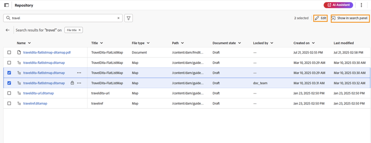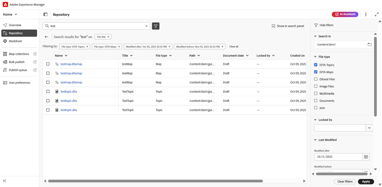 Type de fichier : vous pouvez rechercher toutes les rubriques DITA, cartes DITA, fichiers DITAVAL, fichiers image, Multimedia, Documents et JSON.