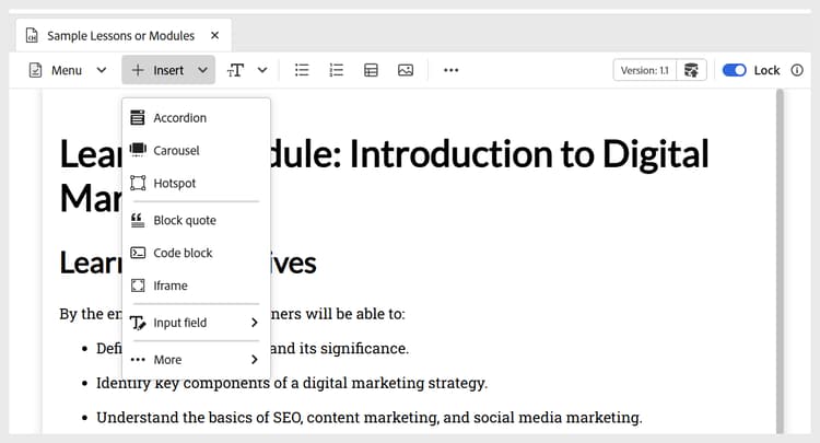 Widgets : ajoutez des widgets tels que l’accordéon, le carrousel, les zones réactives et plus encore à votre sujet ou contenu d’apprentissage à l’aide du menu Insérer comme illustré ci-dessous. Pour plus d’informations sur les widgets interactifs, voir Utilisation de widgets interactifs.