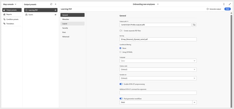 Dans le panneau Paramètres prédéfinis de sortie, sélectionnez l’icône + pour créer un paramètre prédéfini de sortie.