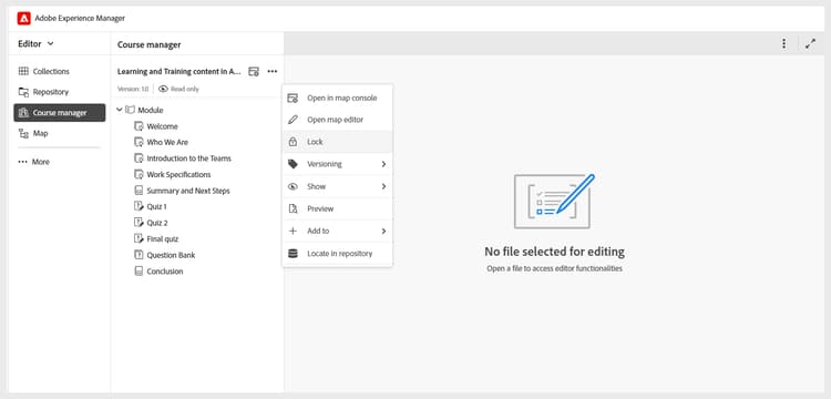 Pour pouvoir modifier un cours, vous devez obtenir un verrouillage à partir du menu Options. Une fois le cours verrouillé, vous pouvez commencer à ajouter des sujets ou à modifier les sujets existants présents dans le cours.