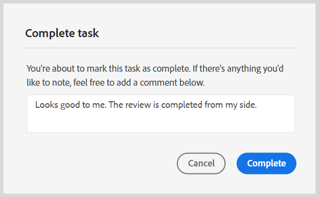 En tant que réviseur ou réviseuse, vous pouvez marquer une tâche de révision comme terminée une fois que vous avez révisé tout le contenu et que vous souhaitez en informer l’auteur ou l’autrice. Vous pouvez également laisser des commentaires finaux à ce stade.