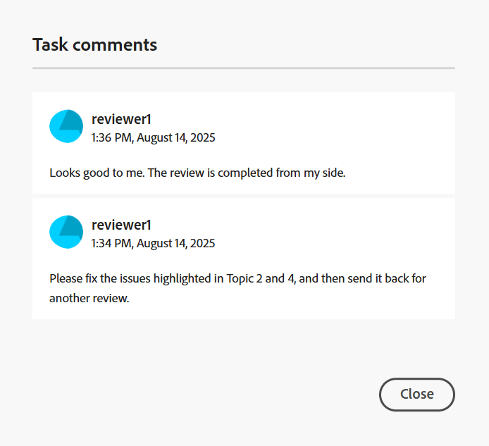 Tous les commentaires au niveau de la tâche sont affichés dans la boîte de dialogue Commentaires des tâches, disponible en mode lecture seule. Lorsque vous terminez une tâche de révision avec un commentaire final, votre saisie est enregistrée dans cette boîte de dialogue pour référence ultérieure.
