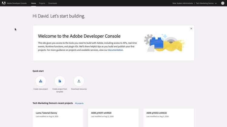 Connectez-vous à Adobe Developer Console à l’aide de l’Adobe ID associé aux comptes et services configurés. Vérifiez que vous êtes administrateur ou administratrice système, ou avez le rôle de développeur ou développeuse pour l’organisation Adobe appropriée.