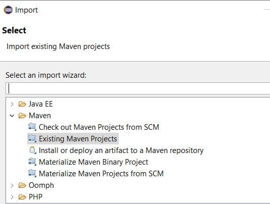 Accédez à Fichier -> Importer et sélectionnez Projets Maven existants comme illustré ici.