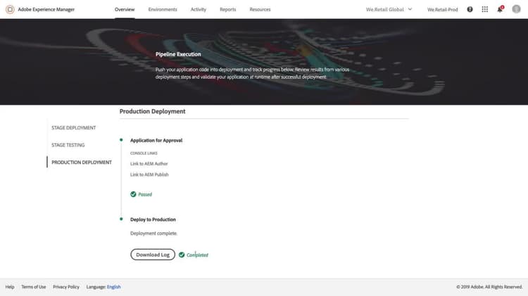 La série de vidéos Utilisation du pipeline CI/CD dans Adobe Cloud Manager plonge en profondeur dans l’exécution du pipeline de production, notamment l’exploration des déploiements échoués et réussis.
