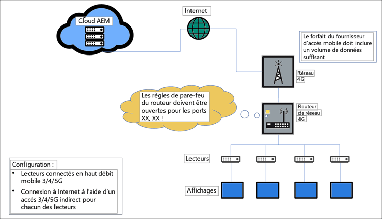 Le diagramme suivant montre la connexion du lecteur AEM Screens au réseau mobile avec routeur de données mobile et composants réseau actifs. La configuration contient un accès Internet pour tous les contrôleurs AEM Screens par un accès Internet direct à l’aide d’une liaison de données 3/4/5G.