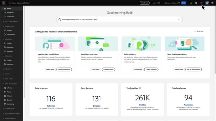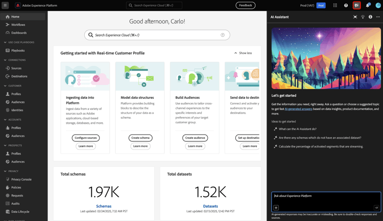 - Accéder à l’application : vous pouvez accéder à l’assistant AI dans Adobe Experience Platform, Adobe Real-Time CDP, Adobe Journey Optimizer et Customer Journey Analytics.