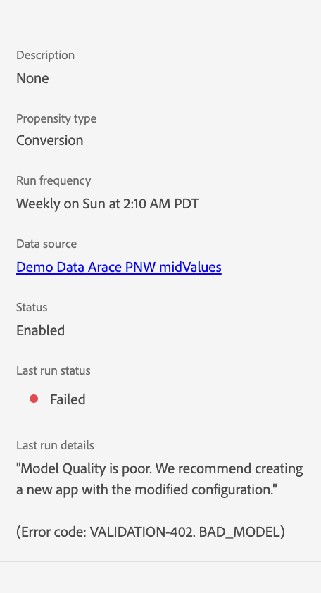 2. Envisagez d’utiliser des sources de données supplémentaires pour améliorer la qualité du modèle. (Code d’erreur : VALIDATION-402 BAD_MODEL)