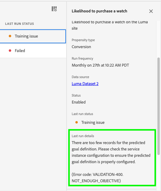 3. Modifiez la définition de l’objectif de prédiction pour inclure plus d’utilisateurs (Code d’erreur : VALIDATION-400 NOT_ENOUGH_OBJECTIVE).