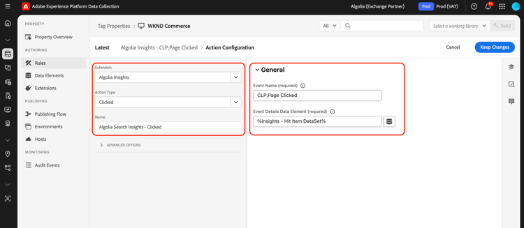 Ajoutez l’action Converted à votre règle de balise pour envoyer les événements convertis à Algolia. Créez une règle de balise ou ouvrez-en une existante. Définissez les conditions en fonction de vos besoins, puis sélectionnez Algolia comme Extension et Converted comme Action Type.