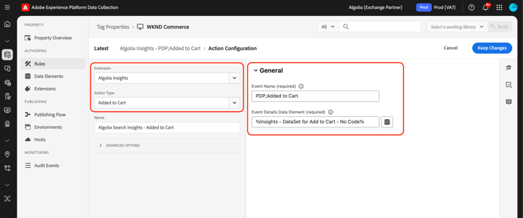 Ajoutez l’action Added to Cart à votre règle de balise pour envoyer les événements ajoutés au panier aux Algolia. Créez une règle de balise ou ouvrez-en une existante. Définissez les conditions en fonction de vos besoins, puis sélectionnez Algolia comme Extension et Added to cart comme Action Type.
