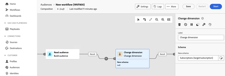 Après avoir ajouté l’activité Modifier la dimension à la zone de travail de composition, vous pouvez définir un nouveau schéma pour remplacer le schéma précédent. Lors de la modification de ce schéma, tous les enregistrements seront conservés.
