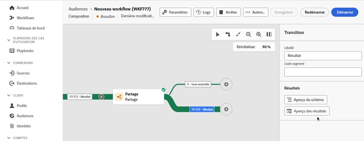 • Prévisualiser les résultats : sélectionnez cette option pour visualiser les données transportées dans la transition sélectionnée. Cette option n’est disponible que si l’option Conserver le résultat des populations intermédiaires entre deux exécutions est activée.