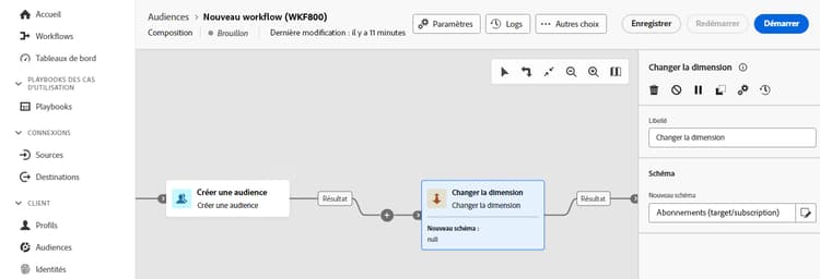 L’activité Changement de dimension vous permet de modifier le schéma, ou dimension de ciblage, à mesure que vous créez une audience. Elle déplace l’axe en fonction du modèle de données et du schéma d’entrée.