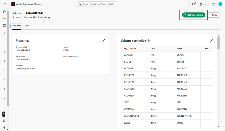 Les tableaux d’une base de données fédérée peuvent être mis à jour, ajoutés ou supprimés. Dans de tels cas, vous devez actualiser le schéma dans Adobe Experience Platform pour vous aligner sur les dernières modifications. Pour effectuer cette action, sélectionnez l’