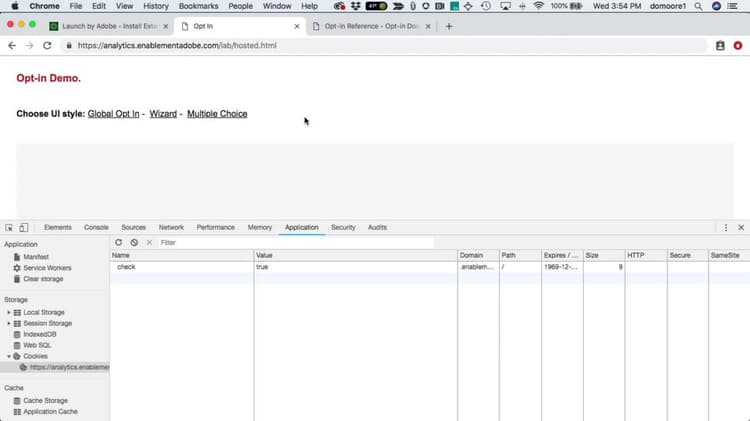 Dans la vidéo suivante, visionnez une démonstration rapide de l’Opt-in sur la page et découvrez comment il peut influer sur si oui ou non les solutions Experience Cloud définissent les cookies, déclenchent les balises, etc.