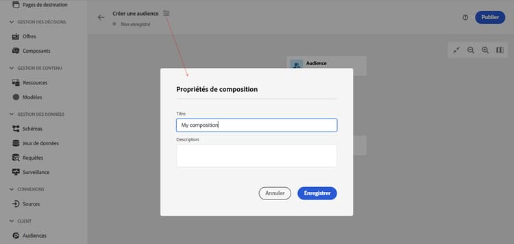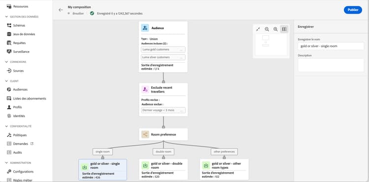 6. Une fois votre composition prête, cliquez sur le bouton Publier pour la publier et enregistrez les audiences obtenues dans Adobe Experience Platform.