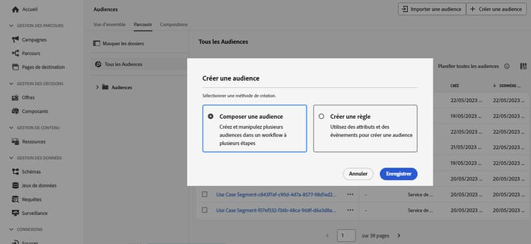 La composition d’audiences est accessible à partir du menu Audiences d’Adobe Journey Optimizer :