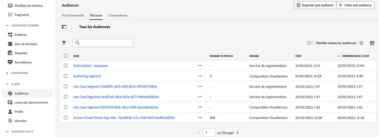 • L’onglet Parcourir répertorie toutes les audiences existantes stockées dans Adobe Experience Platform.