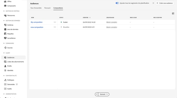 • Publié : la composition a été publiée, les audiences qui en résultent ont été enregistrées et peuvent être utilisées.